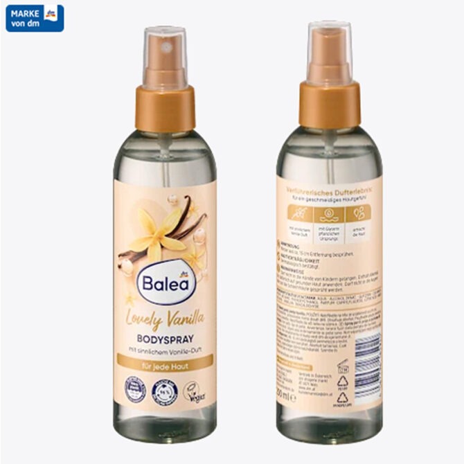 بخاخ الجسم Balea Lovely Vanilla يمنحك انتعاشًا فوريًا مع لمسة من الدفء بفضل رائحة الفانيليا الناعمة والفاخرة. تركيبته خفيفة ولطيفة على البشرة، مناسبة للاستخدام اليومي ولجميع أنواع البشرة. يمكن استخدامه مباشرة بعد الاستحمام أو خلال اليوم لتجديد الانتعاش والعطر.