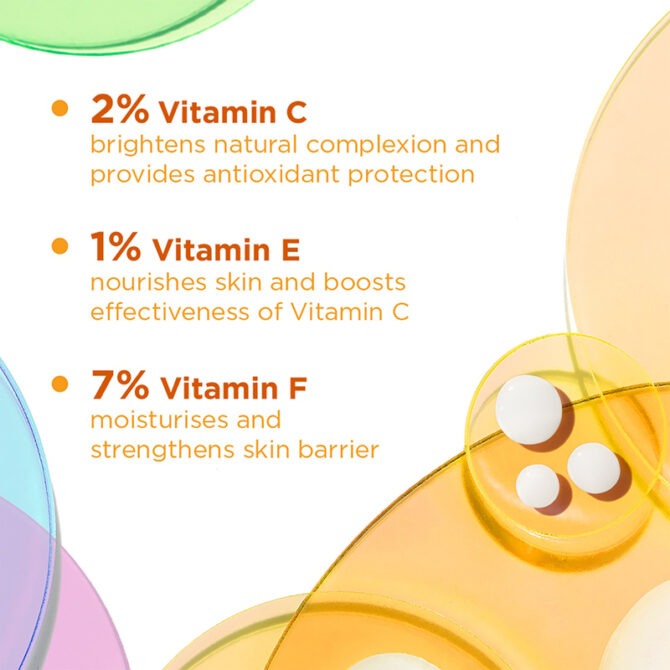 يجمع بين فيتامين C لتفتيح البشرة وتوحيد لونها، وفيتامين E لحماية الجلد من الأكسدة والعوامل البيئية الضارة، وفيتامين F لترميم الحاجز الجلدي وتعزيز الترطيب العميق.