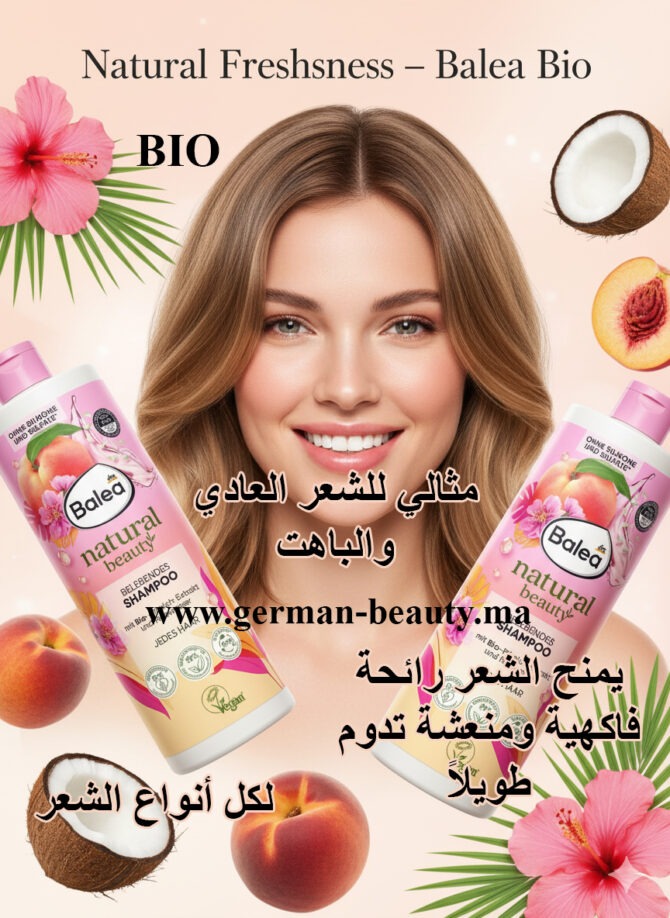 يمنحك شامبو Balea Natural Beauty Bio تجربة عناية طبيعية ومنعشة، بتركيبة فريدة بخلاصة الخوخ العضوي وزهرة الكركديه التي تغذي الشعر وتعيد إليه الحيوية واللمعان الطبيعي.