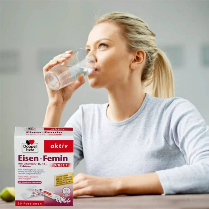 يعد دوبلهيرتز آيزن-فيمين دايركت مكملًا غذائيًا عالي الجودة مصمم خصيصًا لتوفير العناصر الغذائية الأساسية اللازمة لدعم صحة المرأة. يحتوي هذا المنتج على الحديد، حمض الفوليك، فيتامين س، وفيتامينات ب6 و ب12، مما يجعله مثاليًا لتعزيز إنتاج خلايا الدم الحمراء وتحسين مستويات الطاقة.