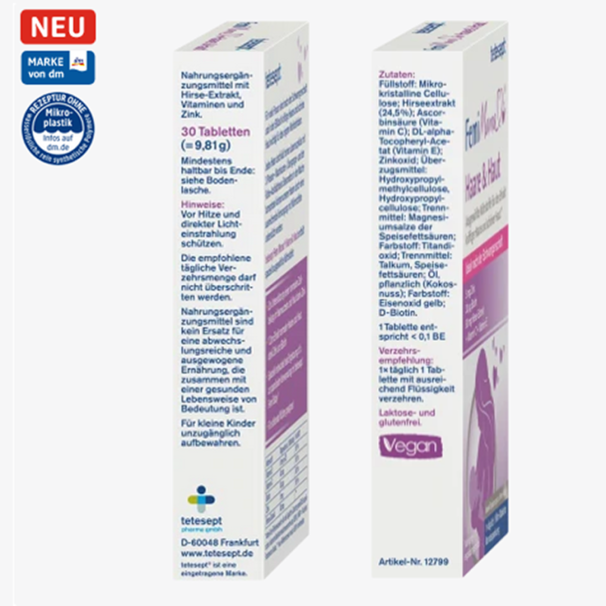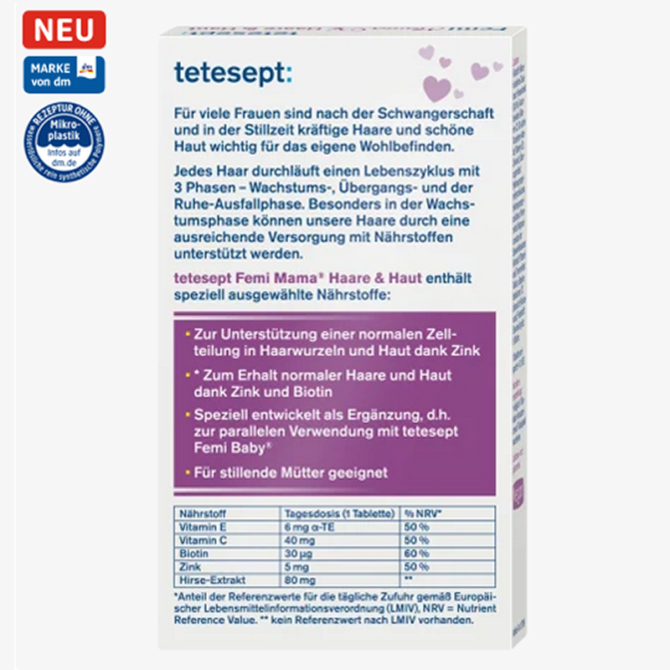 التتيسيبت فيمي ماما® للشعر والبشرة مصمم خصيصًا للنساء بعد الحمل ويوفر البيوتين والزنك للمساهمة في الحفاظ على الشعر القوي والبشرة الجميلة. إنه مثالي بعد الحمل وتم تطويره خصيصًا للنساء بعد الحمل ولكنه مناسب أيضًا للأمهات المرضعات. إنه نباتي ويحتوي على عناصر غذائية مختارة مثل الزنك والبيوتين ومستخلص الدخن وفيتامين سي وفيتامين هـ