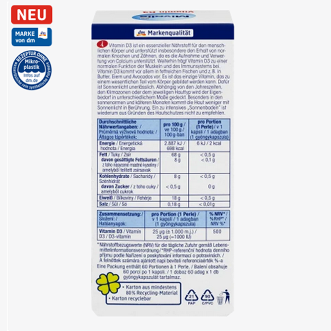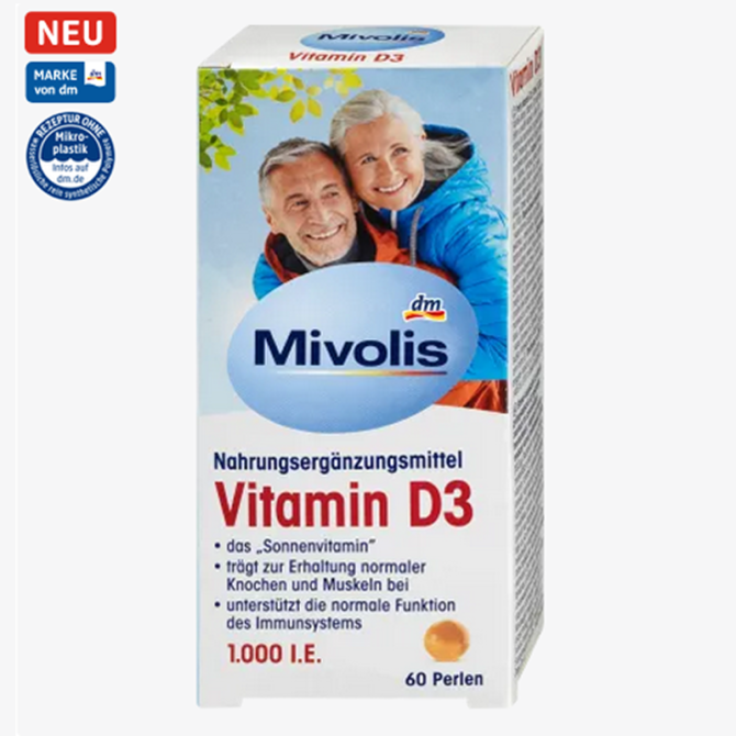 فيتامين D3 المعروف أيضا بـ “فيتامين الشمس” هو عنصر غذائي أساسي لجسم الإنسان ويساعد بشكل خاص في الحفاظ على العظام والأسنان الطبيعية، حيث يساعد في امتصاص واستخدام الكالسيوم. بالإضافة إلى ذلك، يساهم فيتامين D3 في الحفاظ على وظيفة طبيعية للعضلات والجهاز المناعي. يوجد فيتامين D3 بشكل رئيسي في أسماك البحر الدهنية ومنتجات مثل الزبدة والبيض والأفوكادو. إنه الفيتامين الوحيد الذي يمكن تكوينه بشكل أساسي في الجسم. لذلك، فإن أشعة الشمس ضرورية.