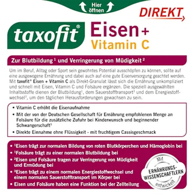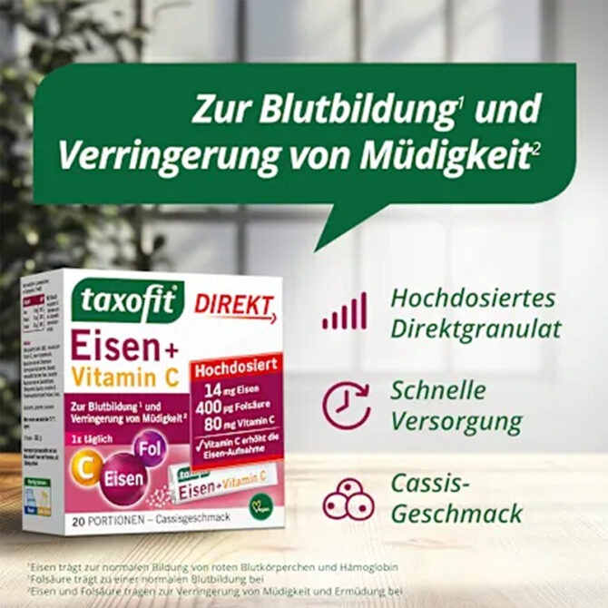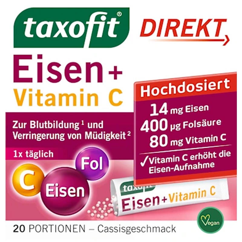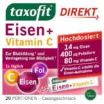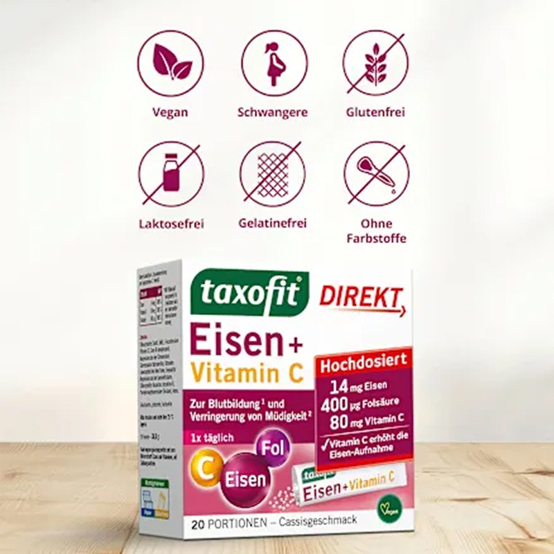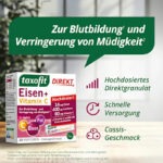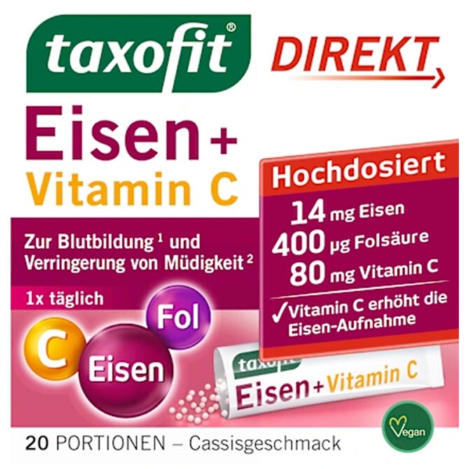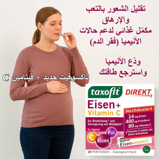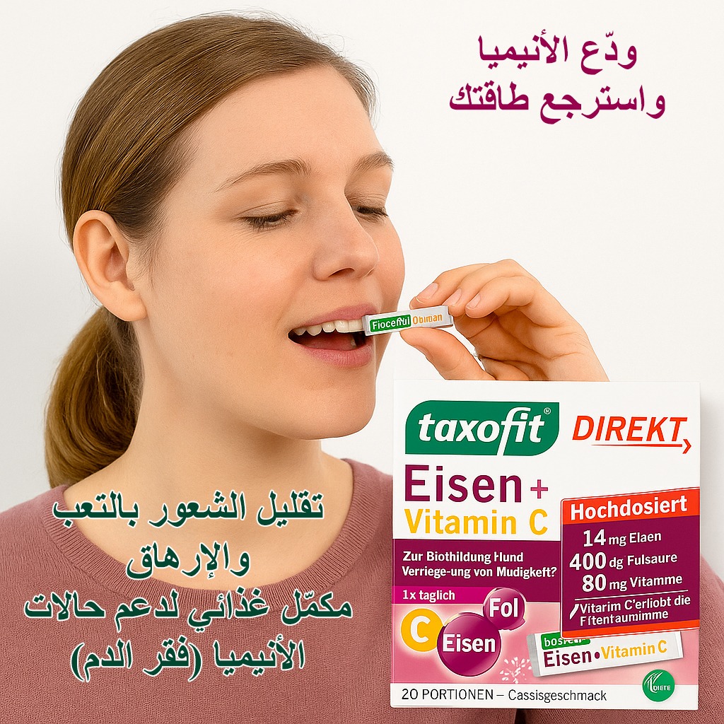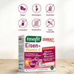 مكمّل taxofit Eisen + Vitamin C DIREKT هو تركيبة فعّالة مصممة لدعم الجسم بالحديد الضروري والمساعدة في تقليل التعب والإرهاق.