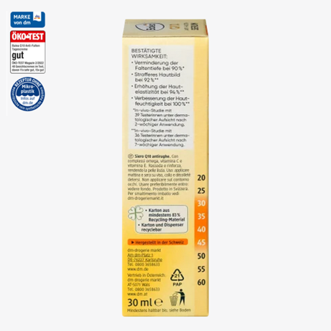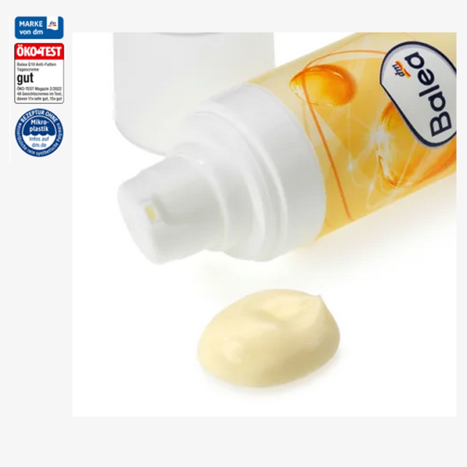 كريم باليا كيو 10 مضاد للتجاعيد للنهار غني بالأحماض الدهنية الأساسية ويعزز من مرونة البشرة. الكيو 10 هو مصدر فعّال للطاقة للخلايا، حيث يساهم بشكل فعّال في تجديد البشرة. يقلل باليا كيو 10 من ظهور التجاعيد الأولى وعمقها (تم تأكيد ذلك في الدراسات). فيتامين إي يحمي البشرة من الجذور الحرة. ومع معامل حماية من الشمس 15 وحماية من الأشعة فوق البنفسجية ، يحمي الكريم البشرة من شيخوخة البشرة المبكرة الناجمة عن التعرض لأشعة الشمس.