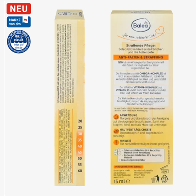 يشد ويقلل من عمق التجاعيد مع مركب أوميغا ومركب فيتامين مصنوع من فيتامينات س و و وصفة خالية من المواد البلاستيكية الدقيقة وبدون بوليمرات صناعية بحتة قابلة للذوبان في الماء بدون رائحة عطرية كريم العين المضاد للتجاعيد باليا ك10 هو منتج للعناية بشد البشرة يمكنه تنعيم التجاعيد الأولى وتقليل عمق التجاعيد. يعتبر ك10 الذي يحتوي عليه مصدرًا فعالاً للطاقة للخلايا، مما يساهم بشكل فعال في تجديد الجلد. التركيبة التي تحتوي على مركب أوميغا غنية بالأحماض الدهنية الأساسية، وتقوي مقاومة الجلد وتدعم وظيفة خلايا الجلد. يعمل مركب الفيتامينات الفعال المكون من فيتامينات س وو على تقوية الدرع الواقي للبشرة ويحميها من الجذور الحرة. يوفر مزيج المكونات النشطة رطوبة مكثفة ويزيد من مرونة البشرة ويقلل التجاعيد الأولى*.
