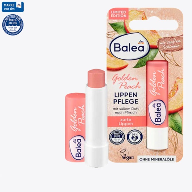 مرطّب الشفاه Balea Golden Peach (إصدار محدود) هو عناية يومية مميزة تمنح الشفاه ترطيباً فعّالاً ونعومة فائقة مع رائحة الخوخ الذهبي المنعشة والحلوة.