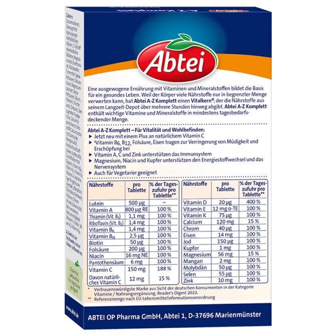 يُعد Abtei A-Z Komplett مكملًا غذائيًا متكاملًا يحتوي على مجموعة واسعة من الفيتامينات والمعادن الأساسية التي يحتاجها الجسم يوميًا، لدعم النشاط، التركيز، المناعة، والصحة العامة.