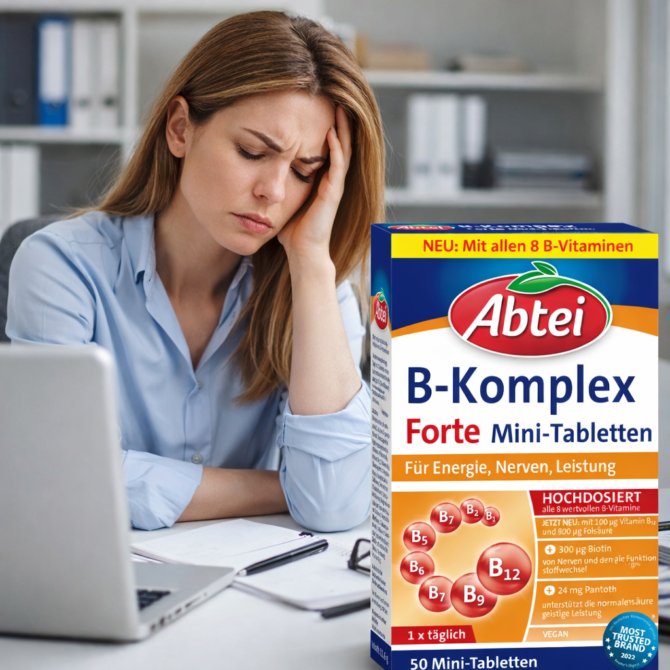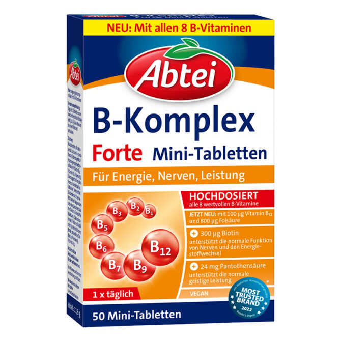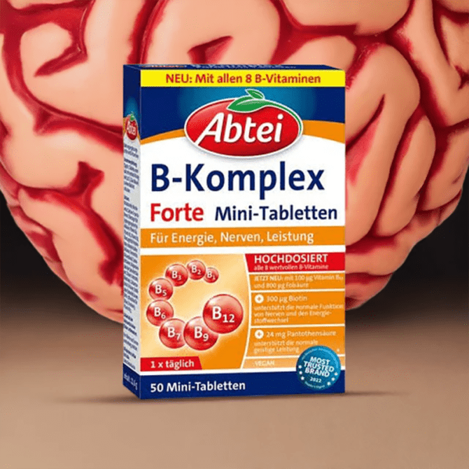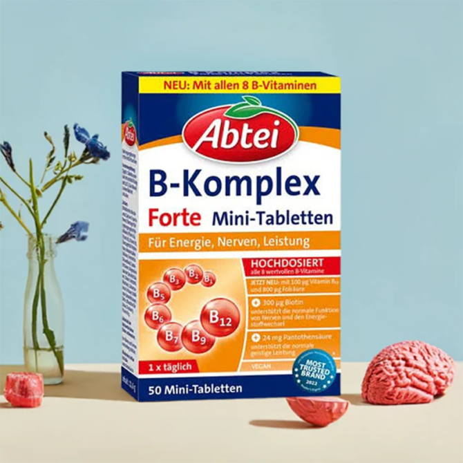 مكمّل Abtei B-Komplex Forte هو تركيبة ألمانية عالية الجودة تحتوي على جميع فيتامينات B الثمانية الأساسية، مصممة لدعم الطاقة، الجهاز العصبي، التركيز، والأداء الذهني.
